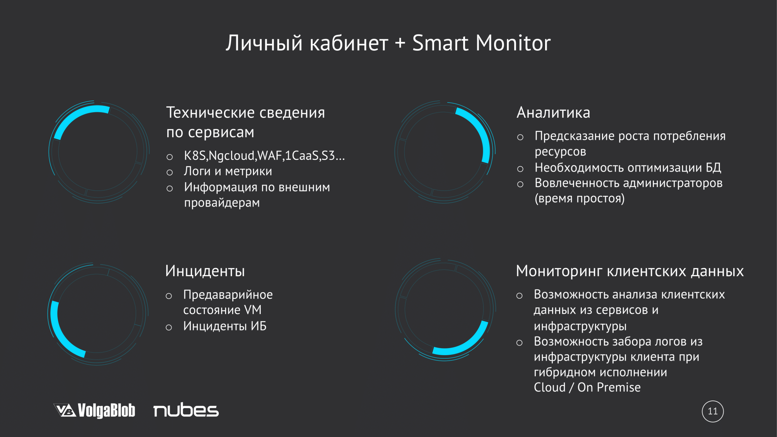 Вместе с Nubes — провайдером облачных решений и сервисов, мы представили совместный доклад о цифровом партнерстве. В рамках сотрудничества удалось ускорить запуск проектов и сократить сроки интеграции, создать демонстрационную площадку Smart Monitor в облаке Nubes и расширить функциональность личного кабинета Nubes для клиентов.
