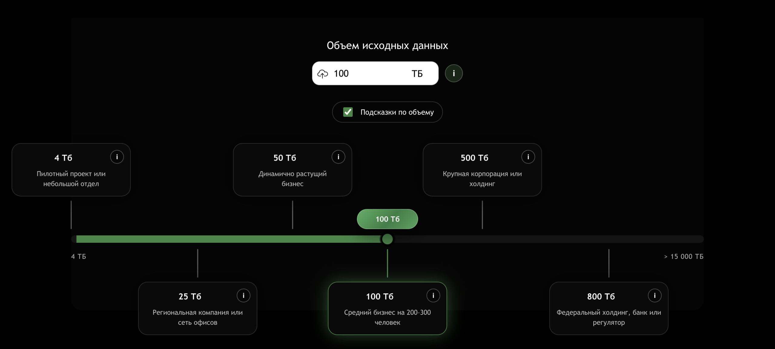 Старая схема постепенно стала слишком технической для прозрачного диалога с заказчиками и партнёрами. Мы решили убрать из разговора о цене всё лишнее и оставить один понятный вопрос: «Сколько данных вам нужно хранить и анализировать?»