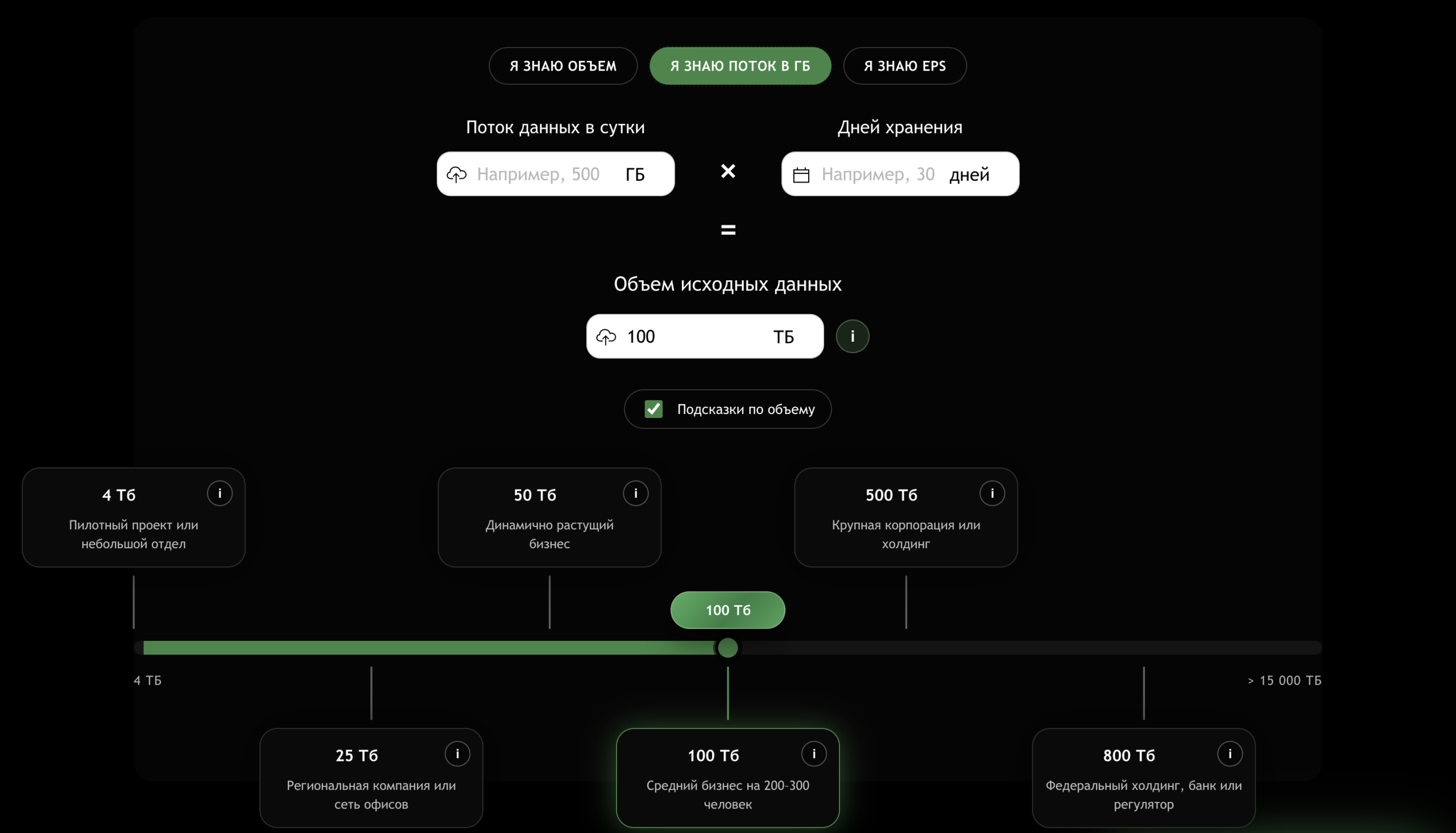 Принцип простой: поток данных умножается на срок хранения. Если у вас уже есть набор данных, мы поможем посчитать, сколько в нём исходных данных. Так же мы подготовили подсказки и калькулятор Терабайт на сайте.